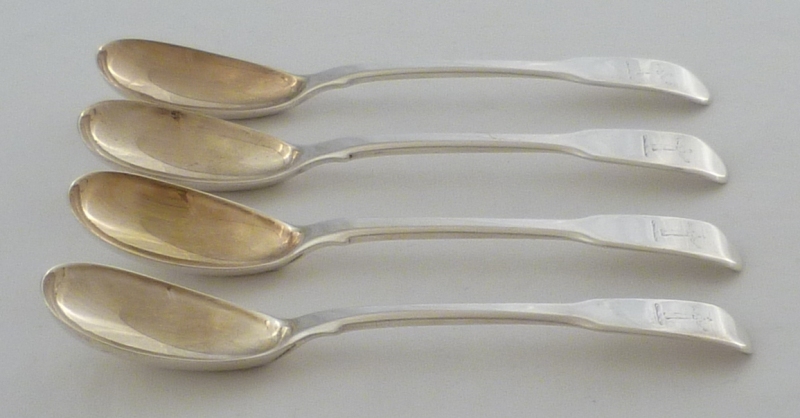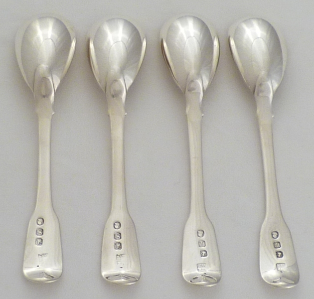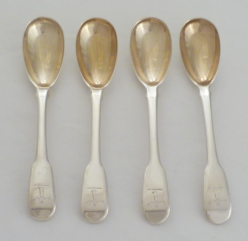DESCRIPTION | Four, two pairs, of good quality Georgian silver Fiddle pattern mustard ladles with gilded bowls and matching crest engravings. Small spoons/ladles with these elongated, egg-shaped bowls are also called egg spoons but in my opinion this could be a misnomer. Yes, their bowls are egg-shaped and they would also serve to raise a quail's egg but for a boiled hen's egg with a runny yolk they are next to useless. The yolk remains within the deep bowl and is uncomfortable to remove orally. |