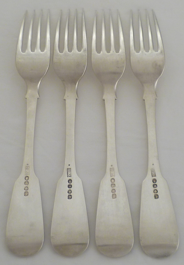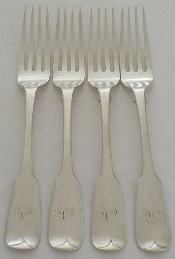 DESCRIPTION | Four William IV silver Fiddle pattern table forks with frontal initial 'A' engraving. |