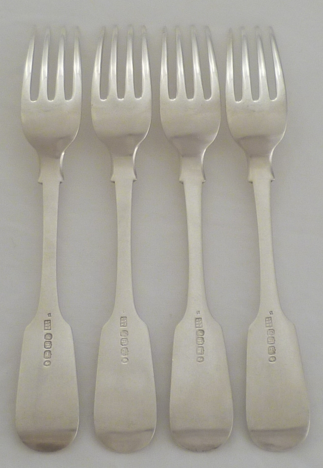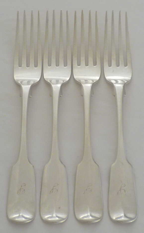 DESCRIPTION | Good set of four Victorian silver Fiddle pattern dessert forks with a frontal initial engraving. |