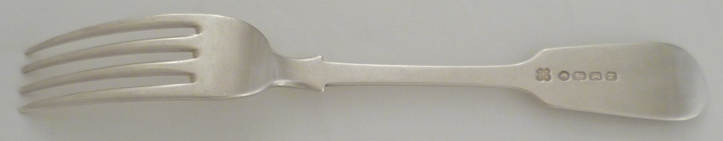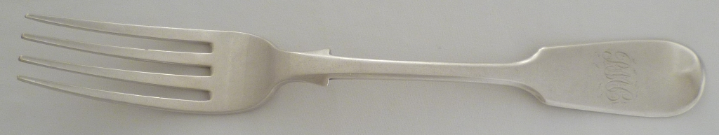 DESCRIPTION | Victorian silver Fiddle pattern table fork with a light frontal monogram engraving. Could be erased for £12. |