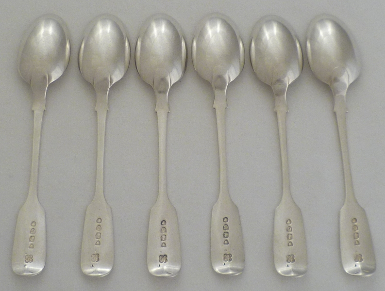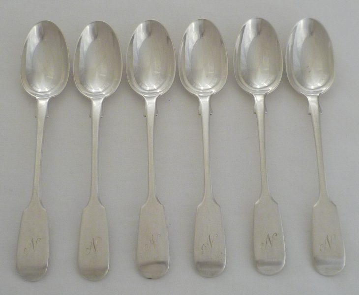 DESCRIPTION | Six Victorian silver Fiddle pattern teaspoons with a frontal initial engraving. |