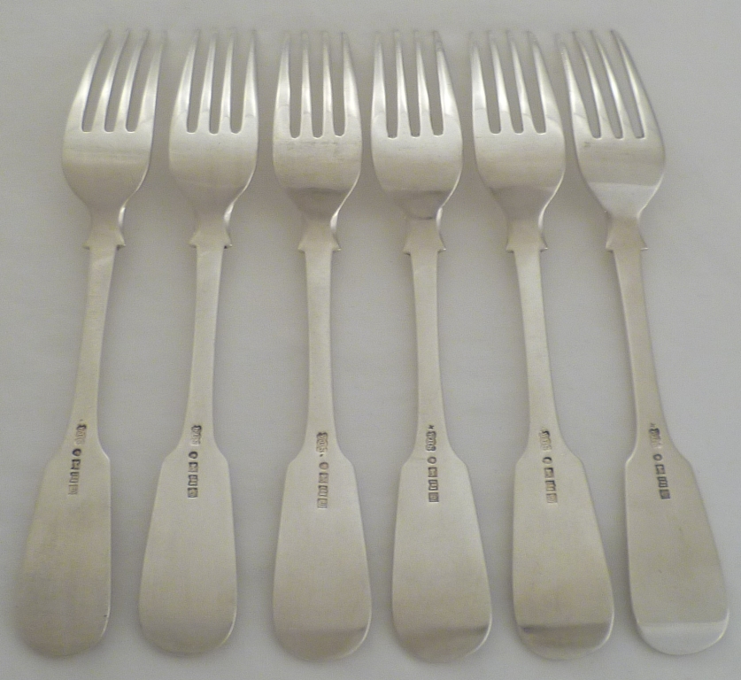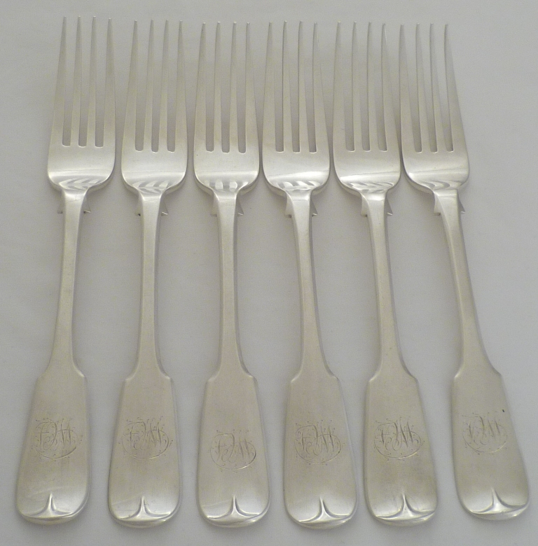 DESCRIPTION | Good set of six Victorian silver Fiddle pattern table forks with a frontal monogram engraving. |
