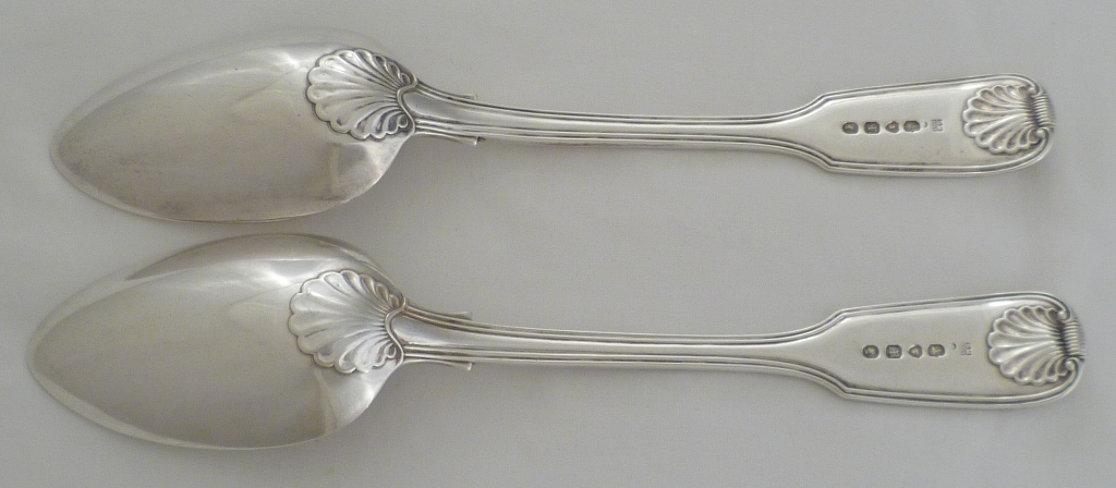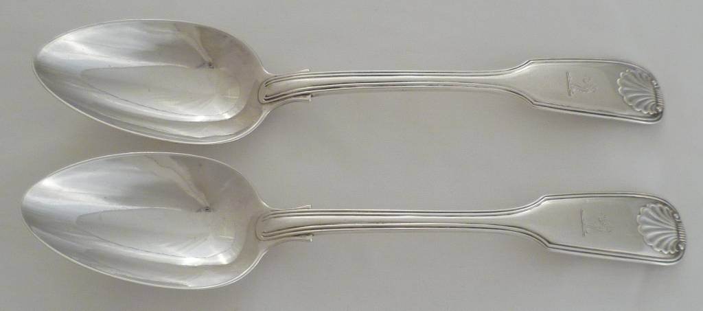DESCRIPTION | Pair of Victorian silver double struck Fiddle Thread and Shell pattern table spoons with union shell heels and frontal crest engraving. |