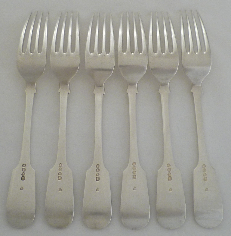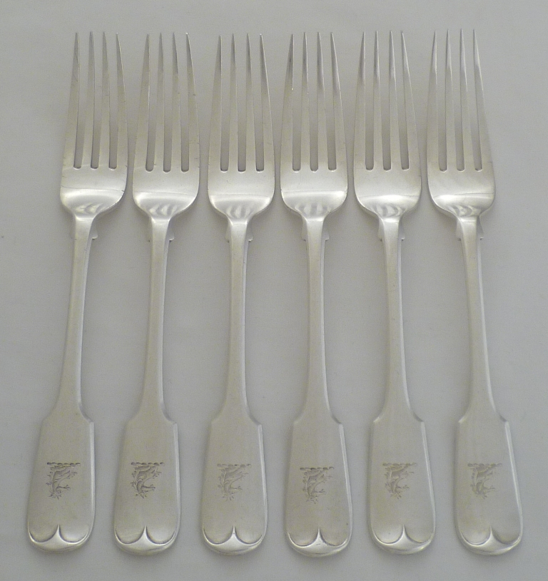 DESCRIPTION | Very good set of six Victorian silver Fiddle pattern dessert forks with an attractive frontal crest engraving. |