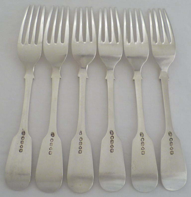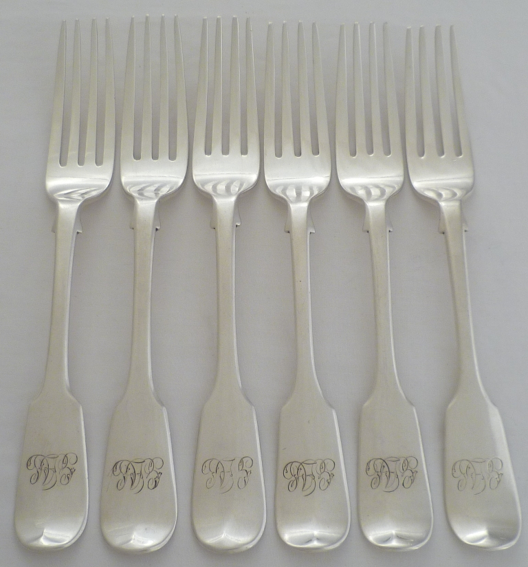DESCRIPTION | Set of six Victorian silver Fiddle pattern table forks with frontal monogram engraving. |