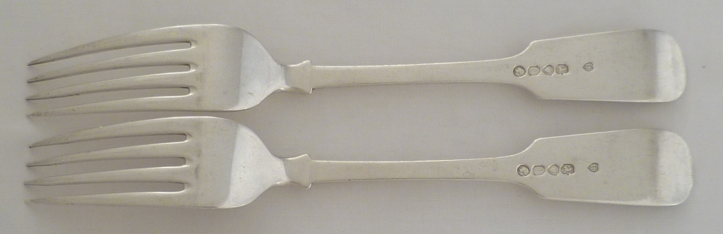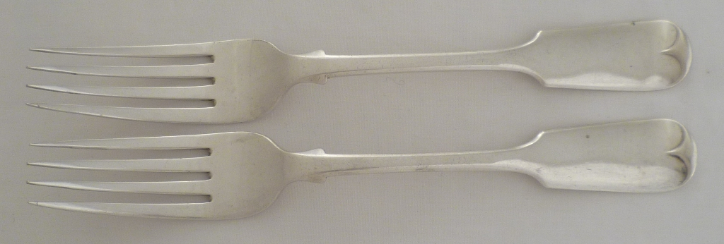 DESCRIPTION | Very good pair of Victorian silver Fiddle pattern table forks with no engraving or erasure. |
