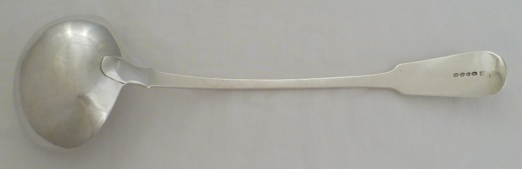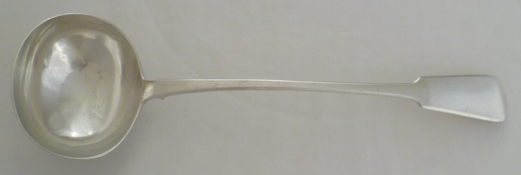 DESCRIPTION | Large Georgian silver Fiddle pattern soup ladle with no engraving or erasure. |
