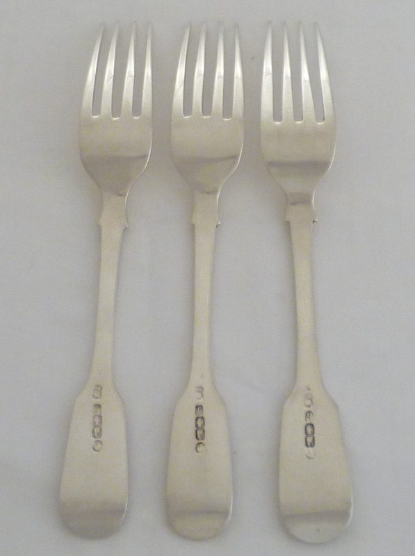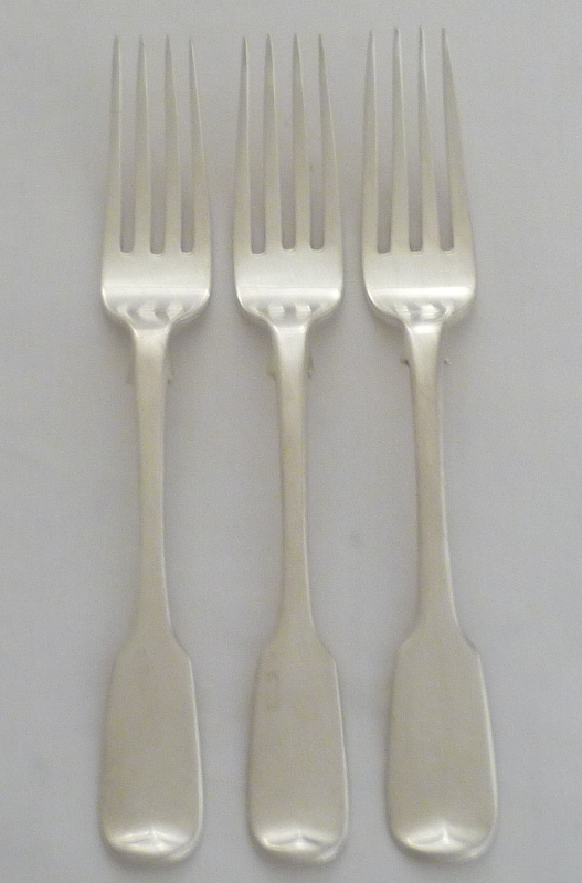DESCRIPTION | Three Irish Victorian silver Fiddle pattern dessert/salad forks with no erasure or engraving. |