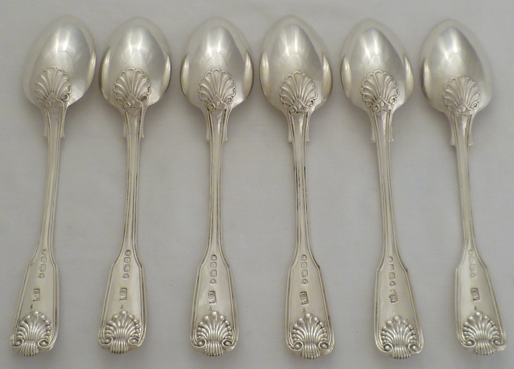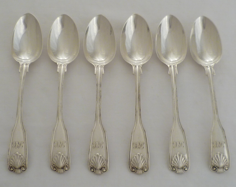 DESCRIPTION | Set of six Victorian silver double struck Fiddle Thread & Shell pattern teaspoons with a frontal monogram engraving. |