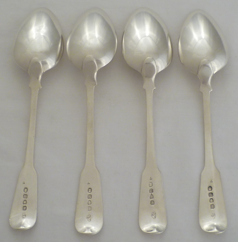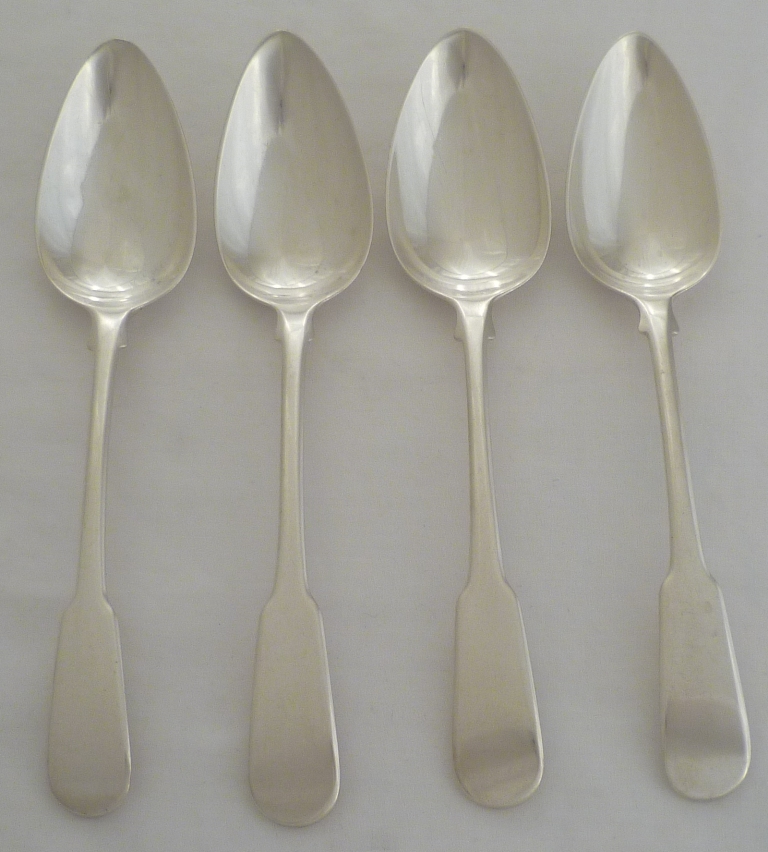 DESCRIPTION | Set of four Georgian silver Fiddle pattern dessert spoons with no engraving or erasure. These are the early form of Fiddle pattern with longer, narrower fiddle sections and bowls. |