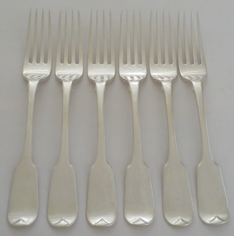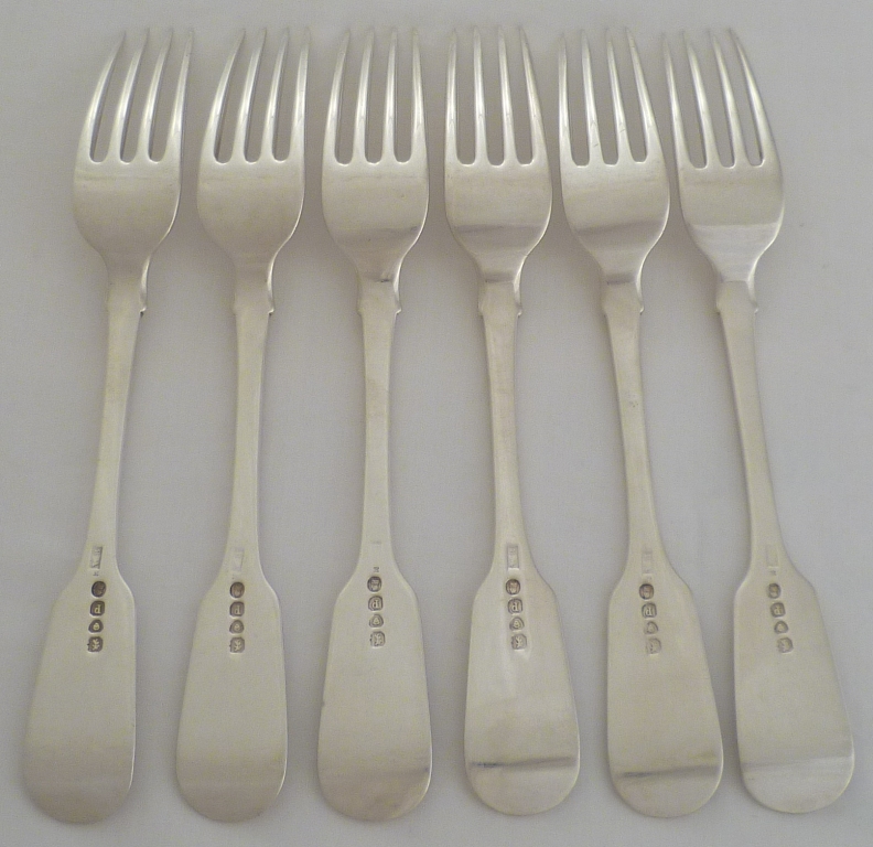 DESCRIPTION | Set of six William IV silver Fiddle pattern table forks with (possible) well executed frontal erasures. |