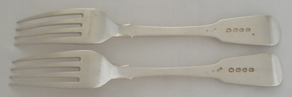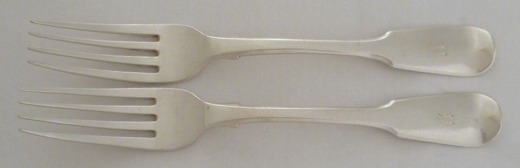 DESCRIPTION | Pair of Georgian silver Fiddle pattern dessert forks with frontal initial engraving. |