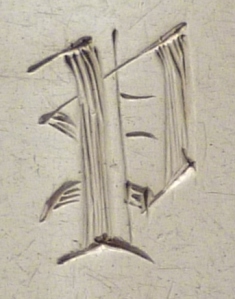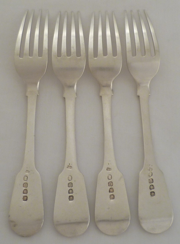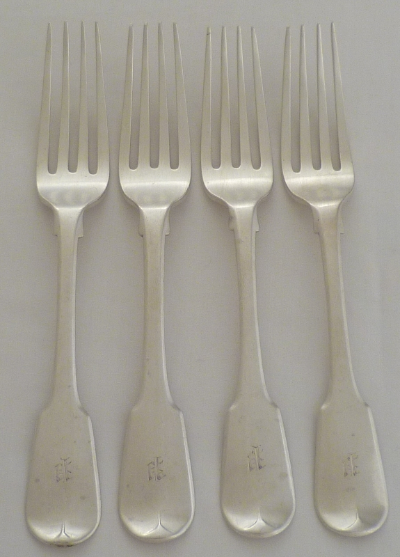DESCRIPTION | Four Georgian silver Fiddle pattern dessert forks with frontal initial engraving. |