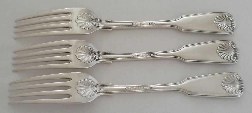 DESCRIPTION | Set of three Victorian silver double struck Fiddle Thread & Shell pattern table forks with no engraving or erasure. |