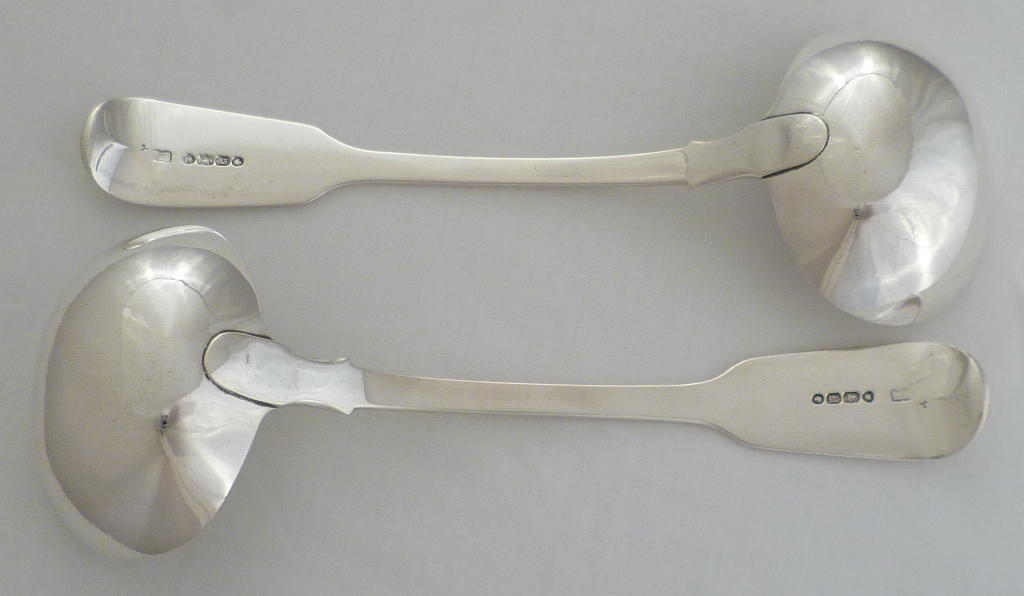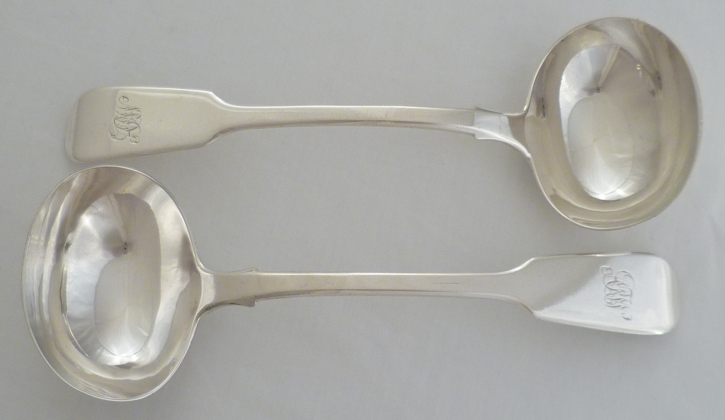 DESCRIPTION | Pair of Victorian silver Fiddle pattern sauce ladles with frontal monogram engraving. |