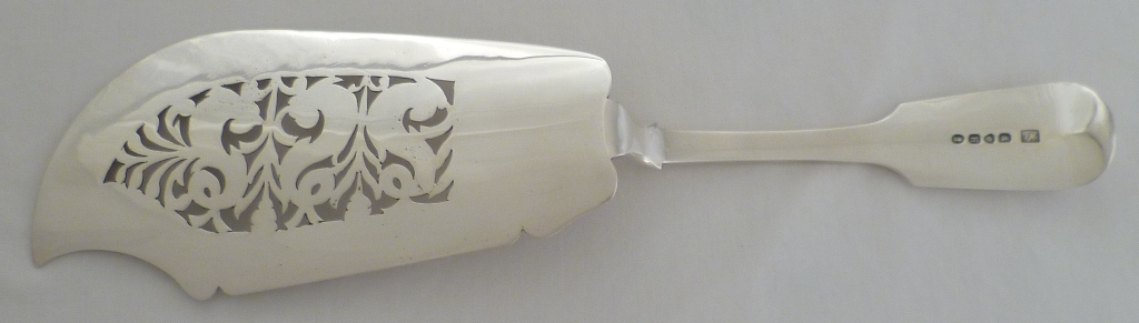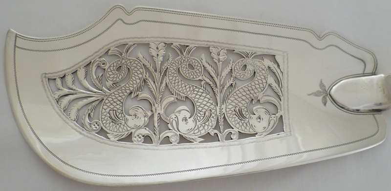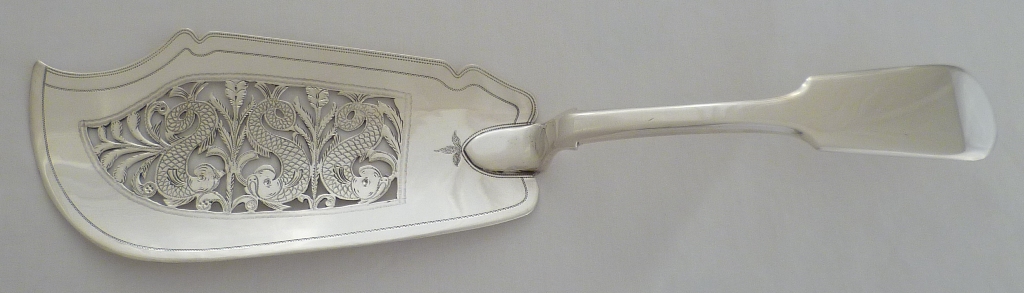 DESCRIPTION | Georgian silver Fiddle pattern fish server, the blade pierced and engraved with fish amongst foliage and no engraving or erasure to the terminal. |