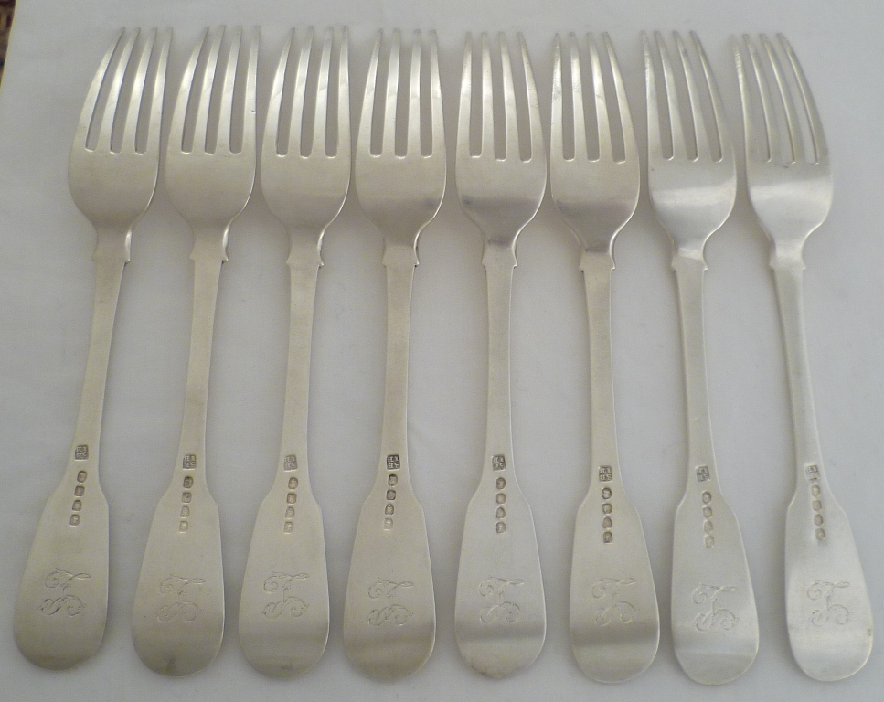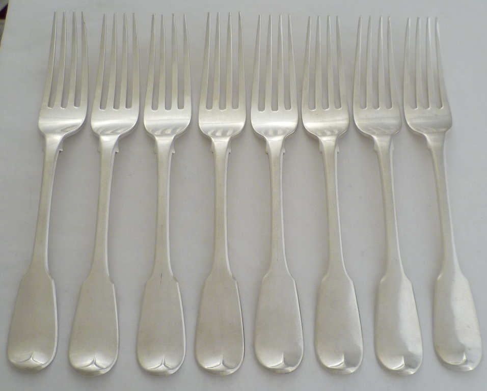 DESCRIPTION | Good set of eight Georgian silver Fiddle pattern table forks with initial 'L' engraved verso. |
