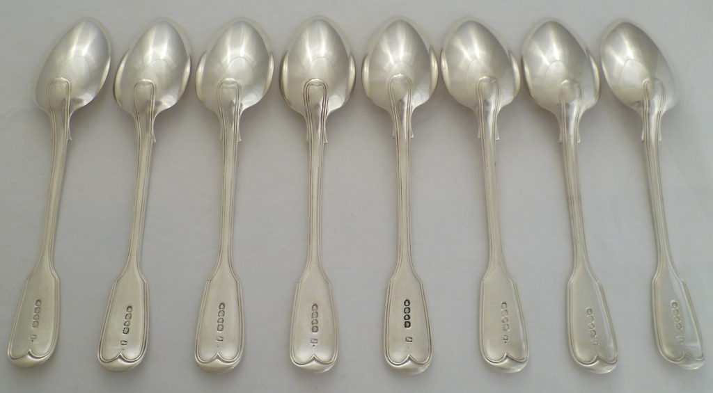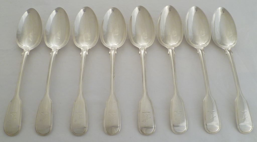 DESCRIPTION | Set of eight Victorian silver double struck Fiddle & Thread pattern table spoons with a frontal crest engraving. |