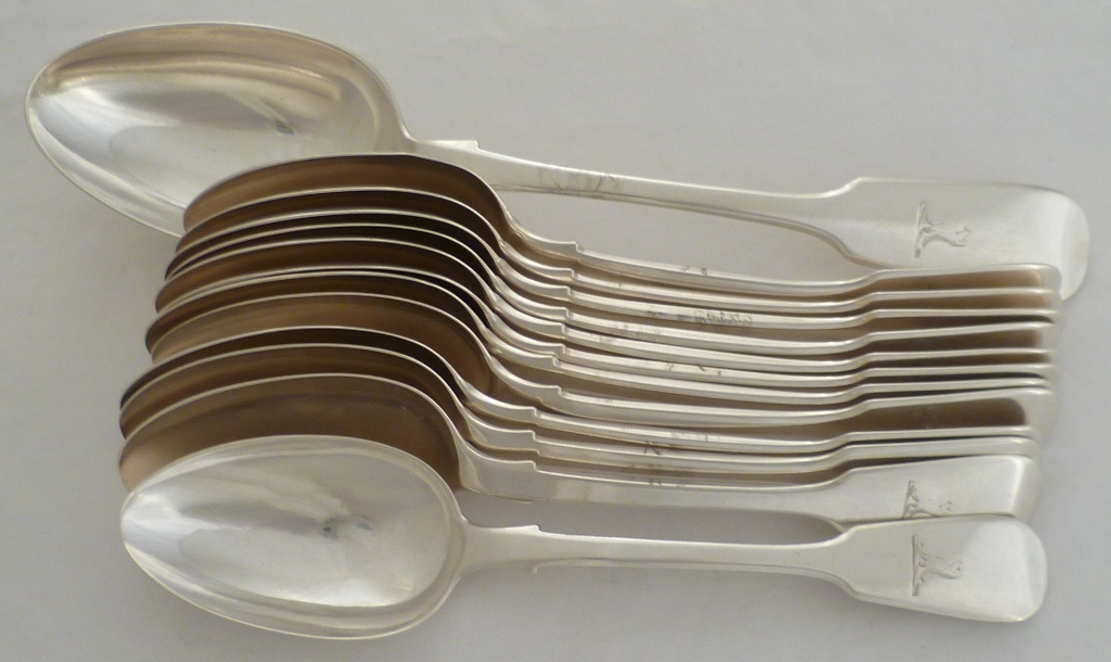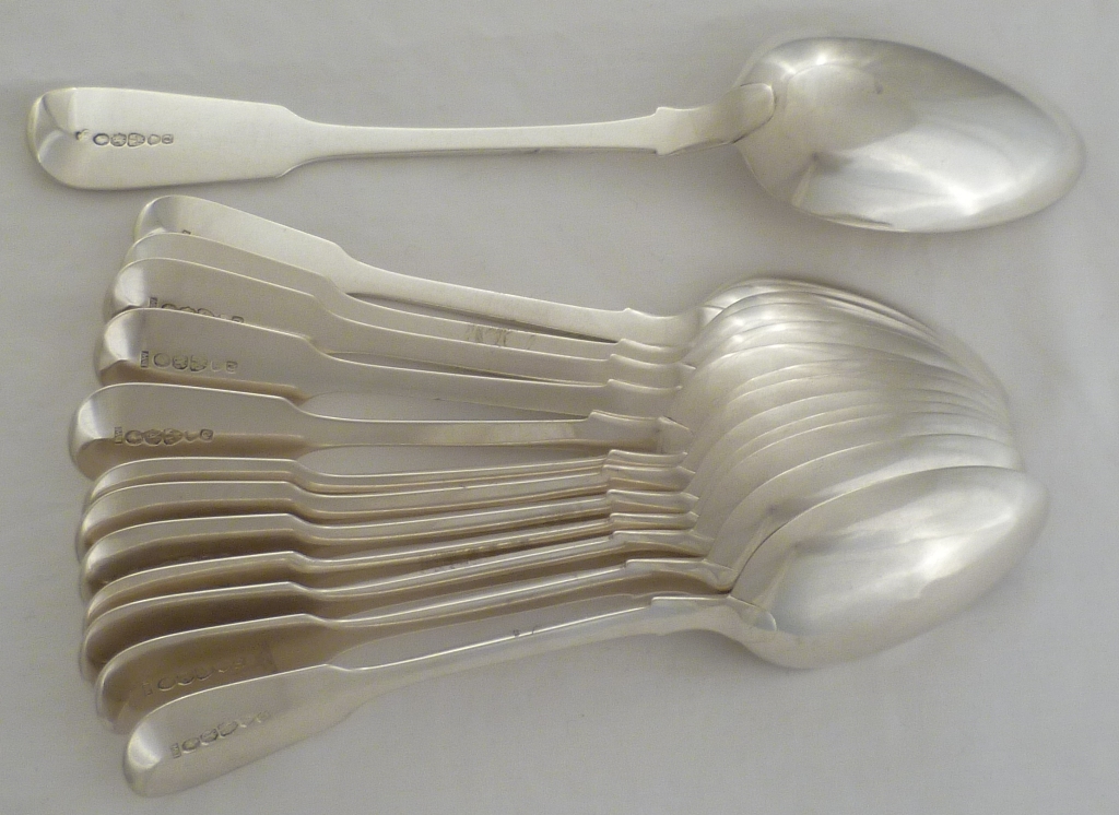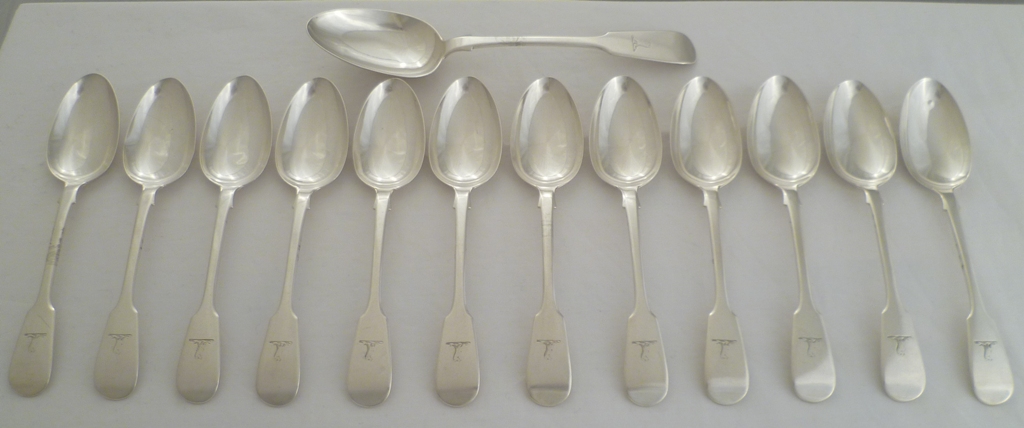 DESCRIPTION | Thirteen Victorian silver Fiddle pattern spoons comprising of twelve dessert and one large table/serving all with a matching frontal crest engraving. |