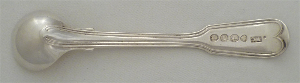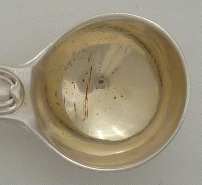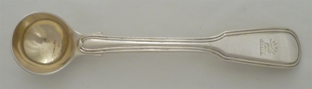 DESCRIPTION | Georgian silver gilt double struck Fiddle & Thread pattern salt spoon with a frontal crest engraving. |