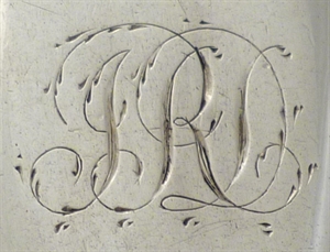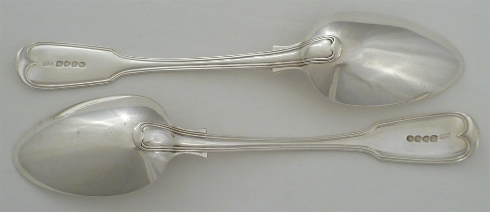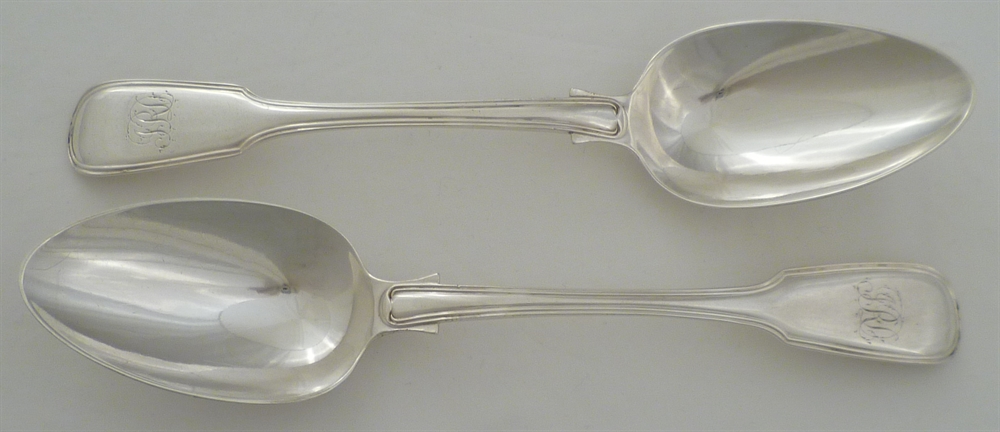 DESCRIPTION | Pair of William IV silver double struck Fiddle & Thread pattern table spoons with frontal monogram engraving. |