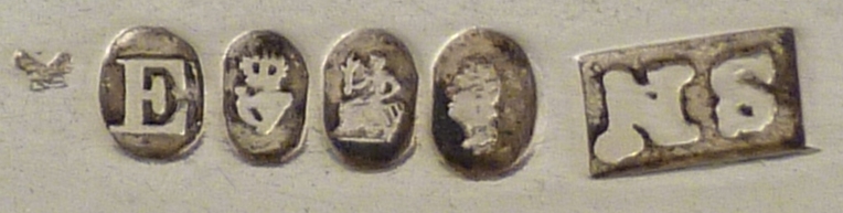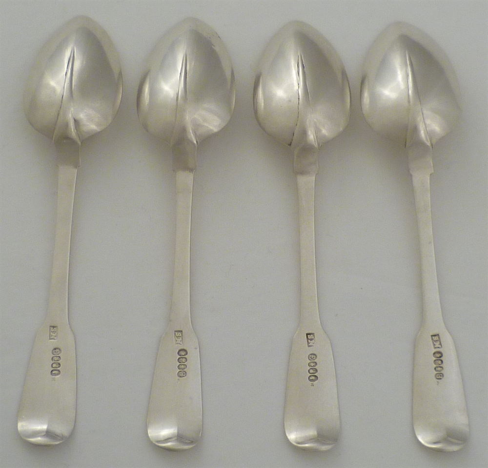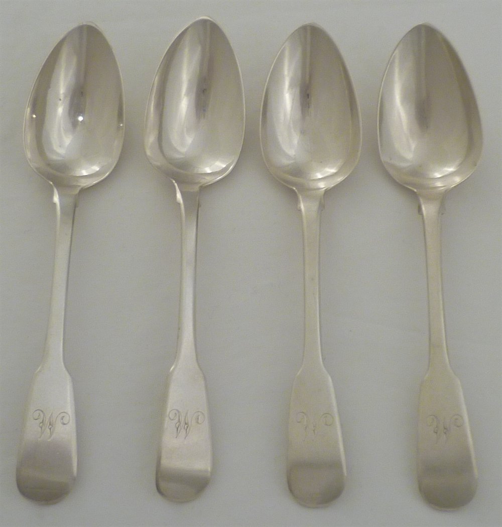 DESCRIPTION | Four Georgian Irish silver Fiddle with Rat Tail pattern teaspoons with frontal initial engraving. |