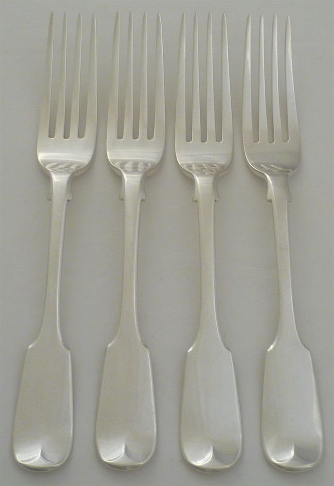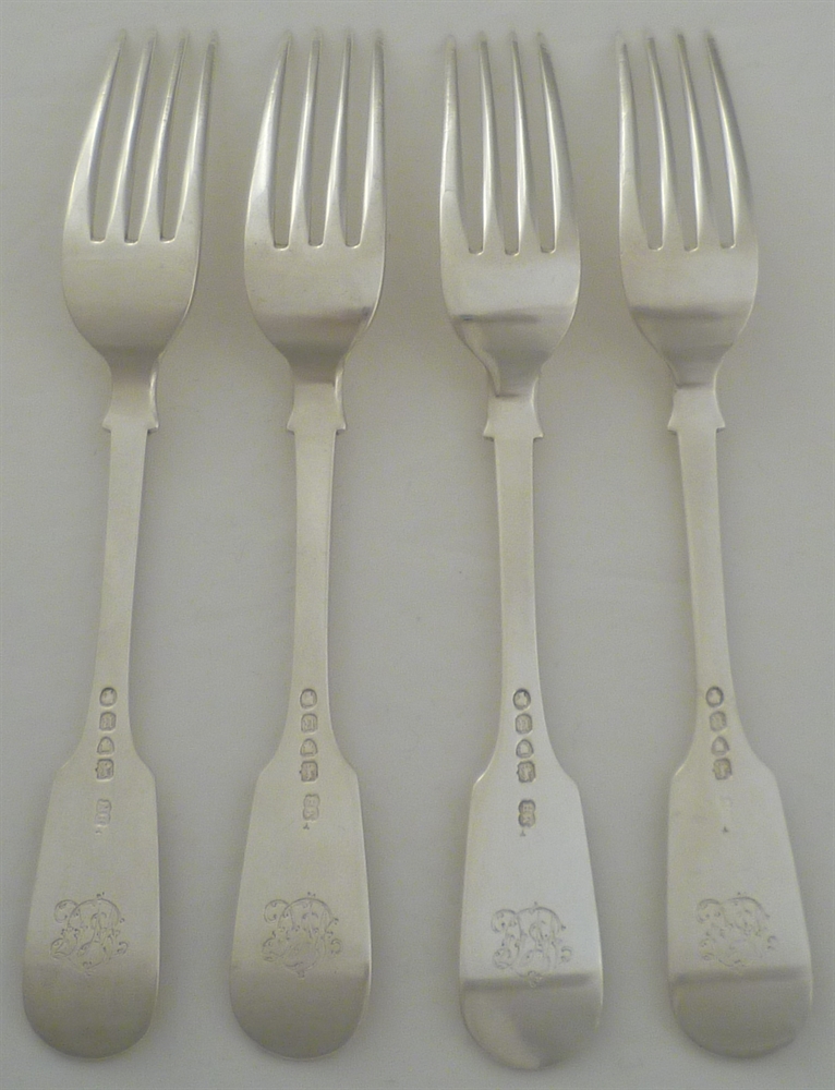 DESCRIPTION | Set of four Victorian silver Fiddle pattern table forks with monogram engraving verso. |