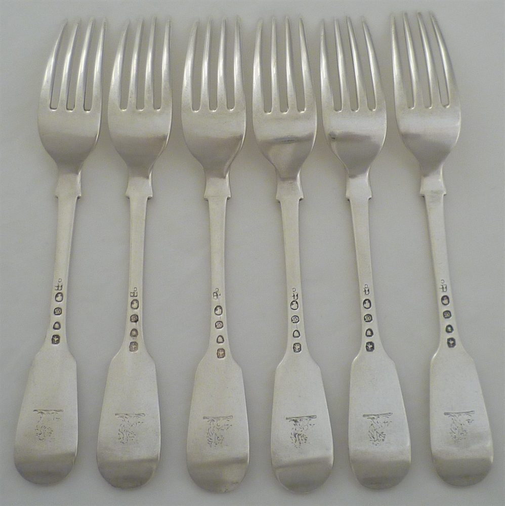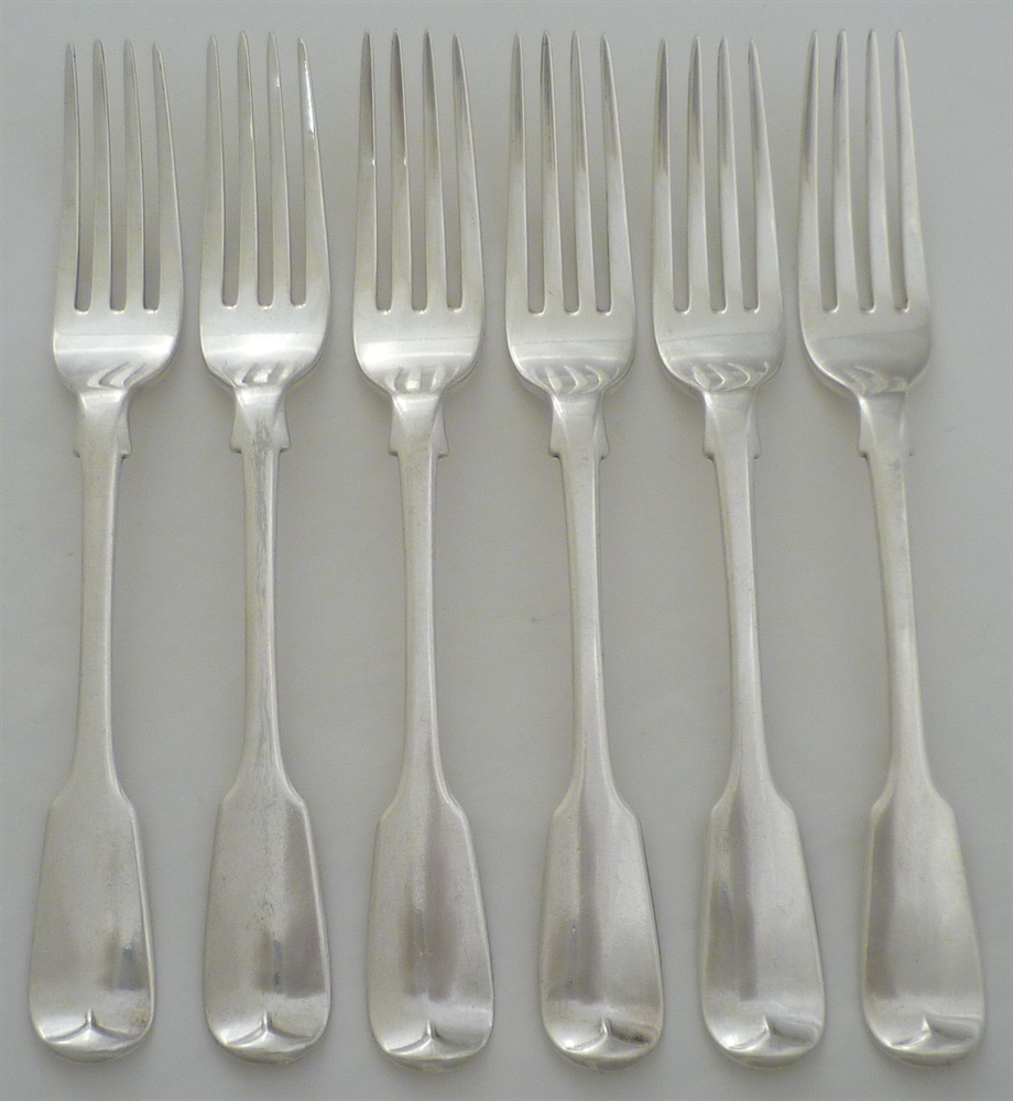 DESCRIPTION | Set of six Victorian silver Fiddle pattern dessert or salad forks with crest engraving verso. |