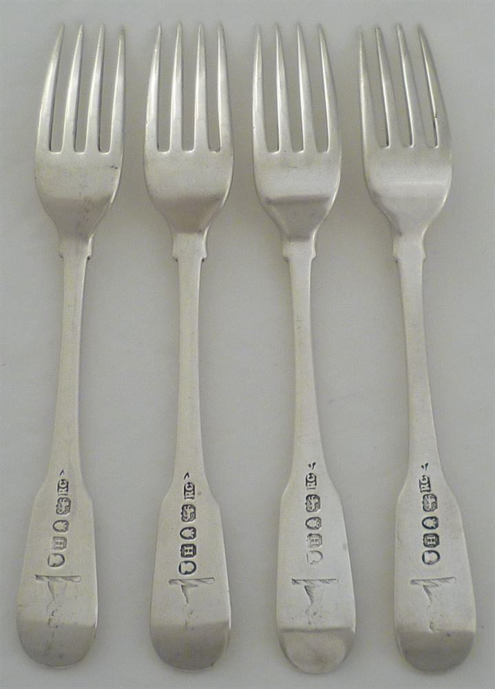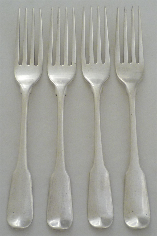 DESCRIPTION | Four Georgian silver early Fiddle pattern dessert or salad forks with crest engraving verso. |