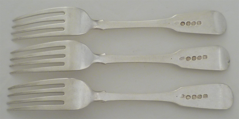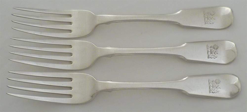 DESCRIPTION | Three Georgian silver Fiddle pattern dessert or salad forks with frontal crest engraving. |