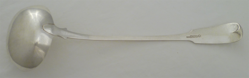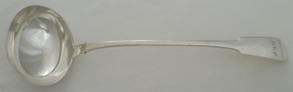 DESCRIPTION | Georgian Scottish silver Fiddle pattern soup ladle with frontal monogram engraving. |