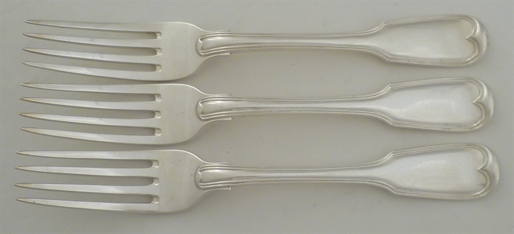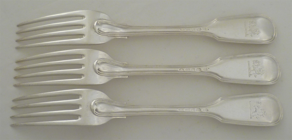 DESCRIPTION | Three Georgian silver Fiddle & Thread pattern table forks with a crest engraving verso. |