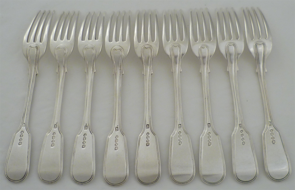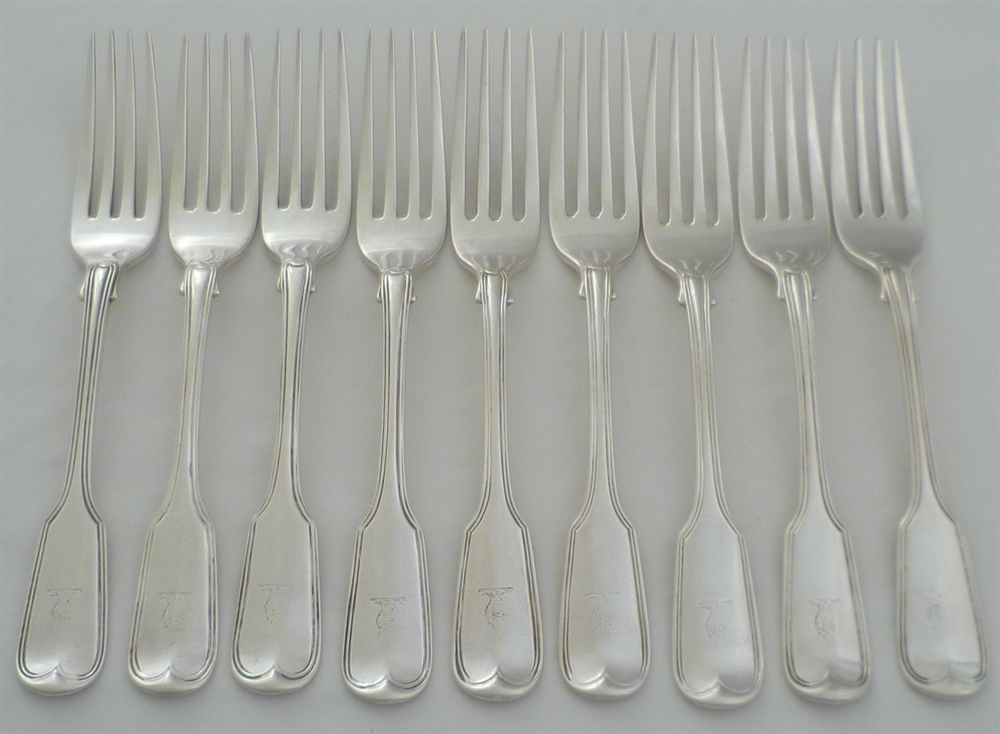 DESCRIPTION | Nine Victorian silver Fiddle & Thread pattern dessert or salad forks with frontal crest engraving. Matching pieces available. |