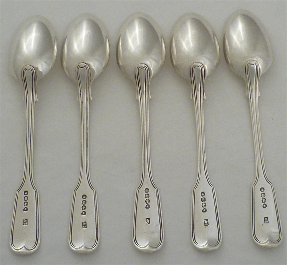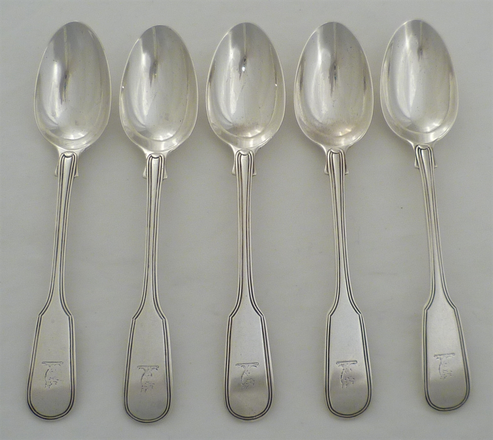DESCRIPTION | Five Victorian silver Fiddle & Thread pattern teaspoons with frontal crest engraving. Matching pieces available. |