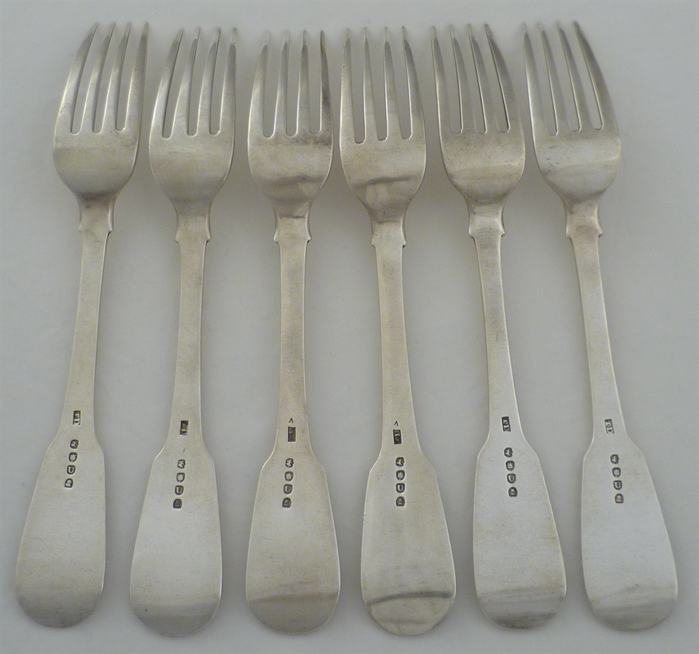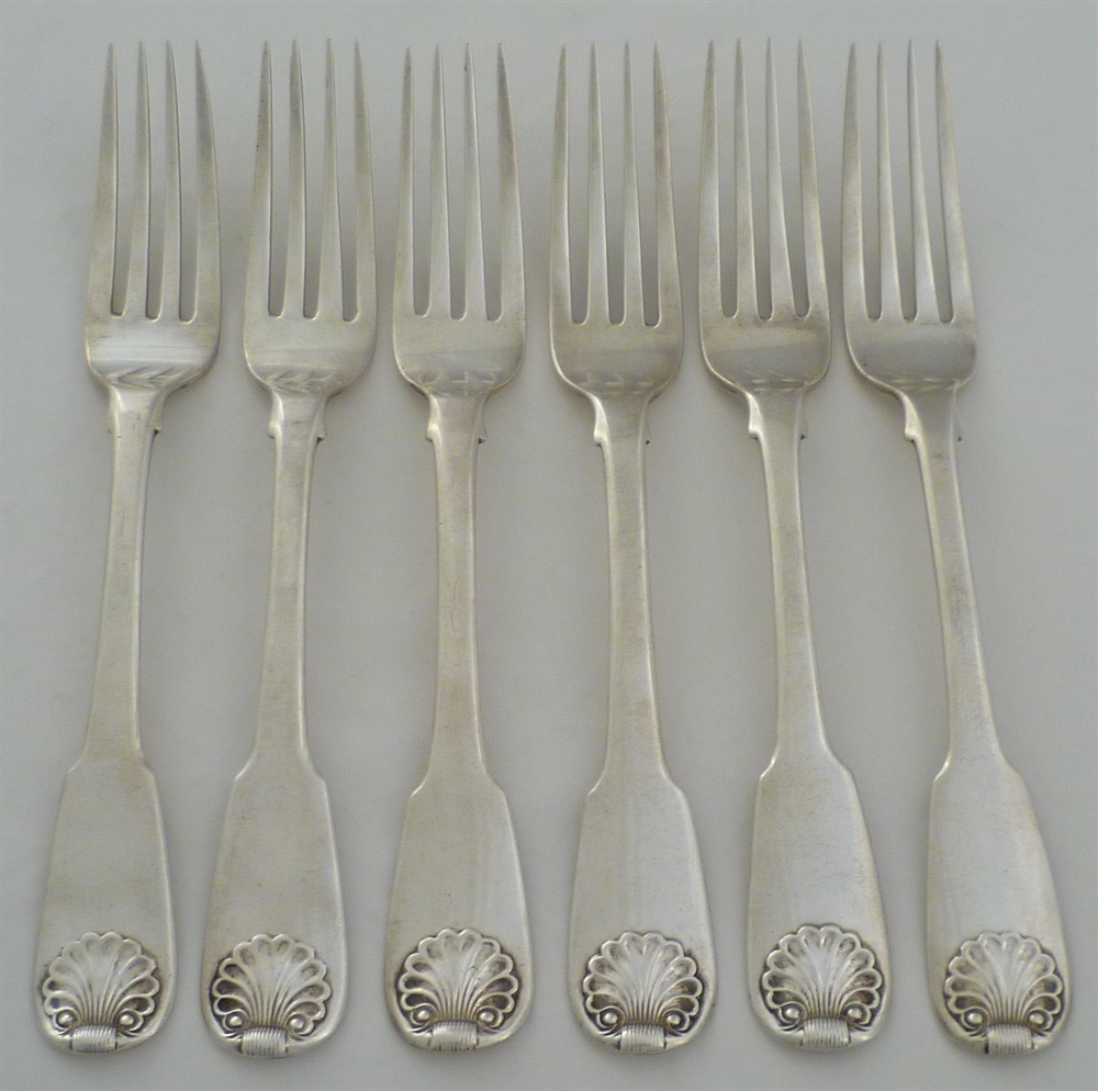 DESCRIPTION | Six Georgian silver Fiddle & Shell pattern table forks with no engraving or erasure. |