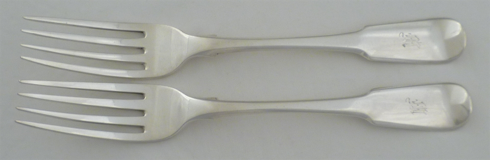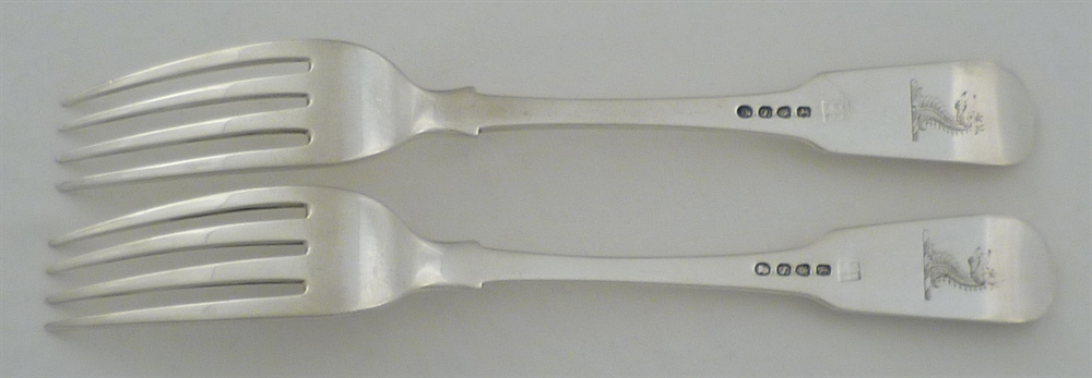 DESCRIPTION | Pair of Georgian silver Fiddle pattern table forks with frontal initial and crest engraving verso. |