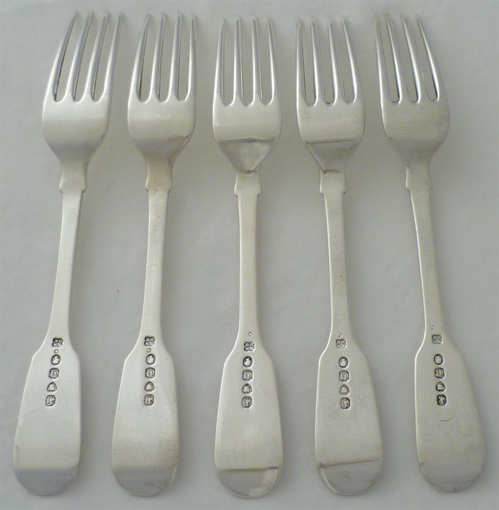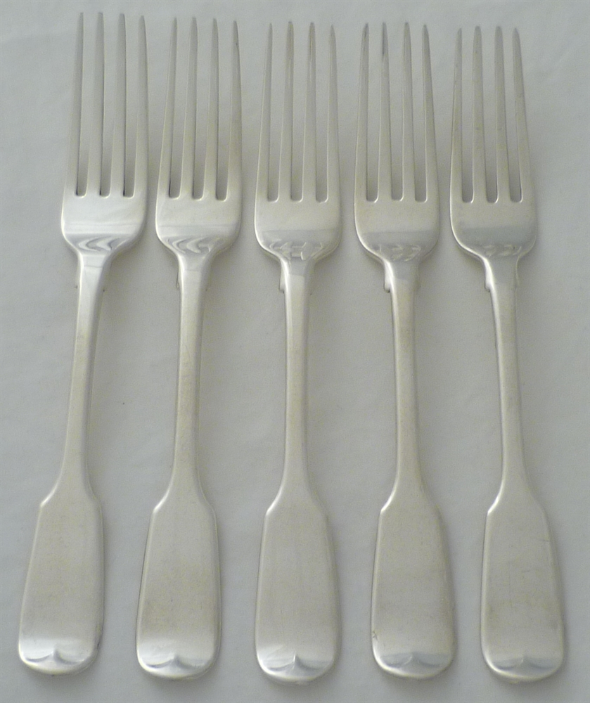 DESCRIPTION | Five Victorian silver Fiddle pattern dessert or salad forks with no engraving. |