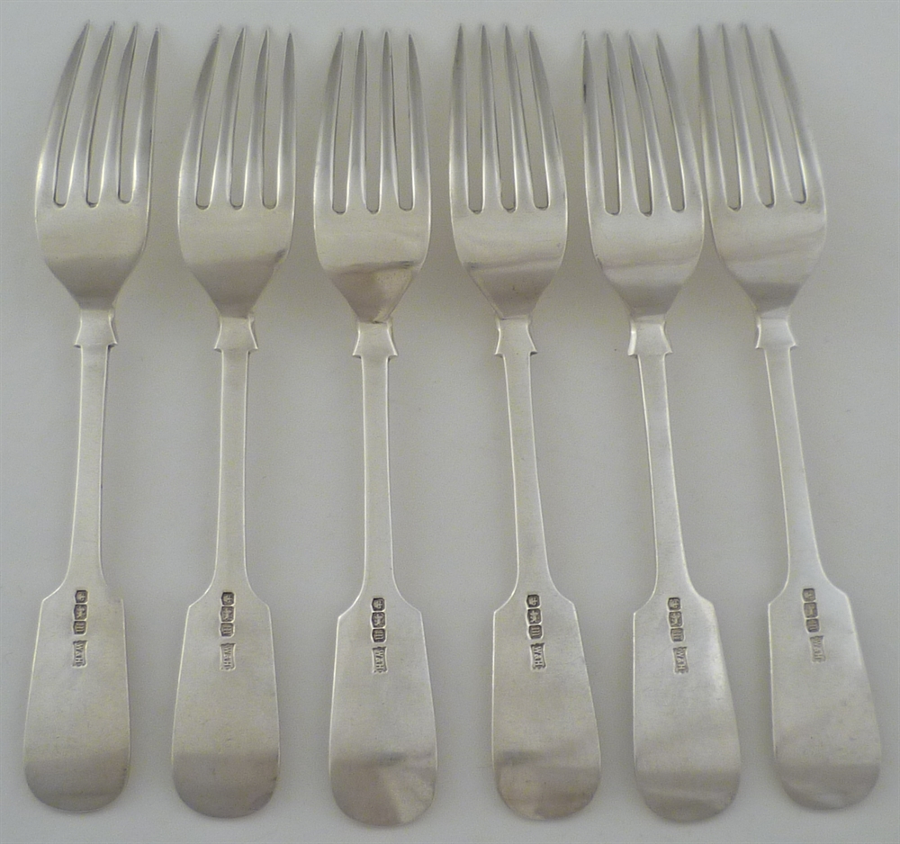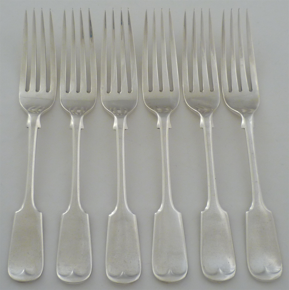 DESCRIPTION | Six solid silver Fiddle pattern dessert or salad forks with large, long, level tines and no engraving. |
