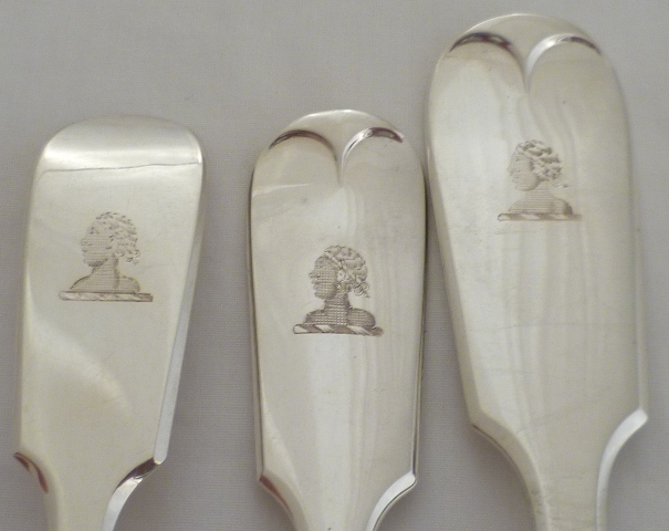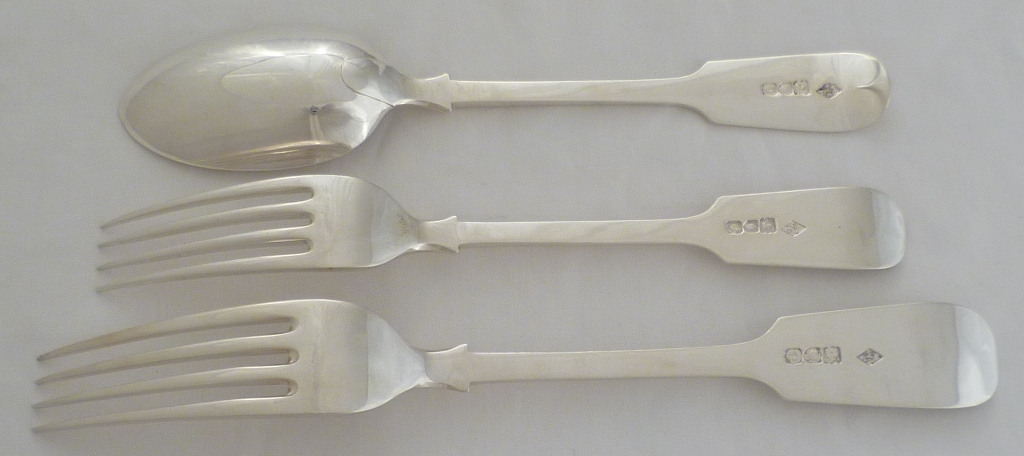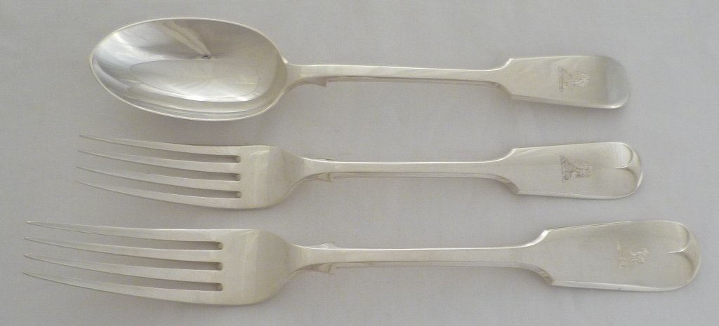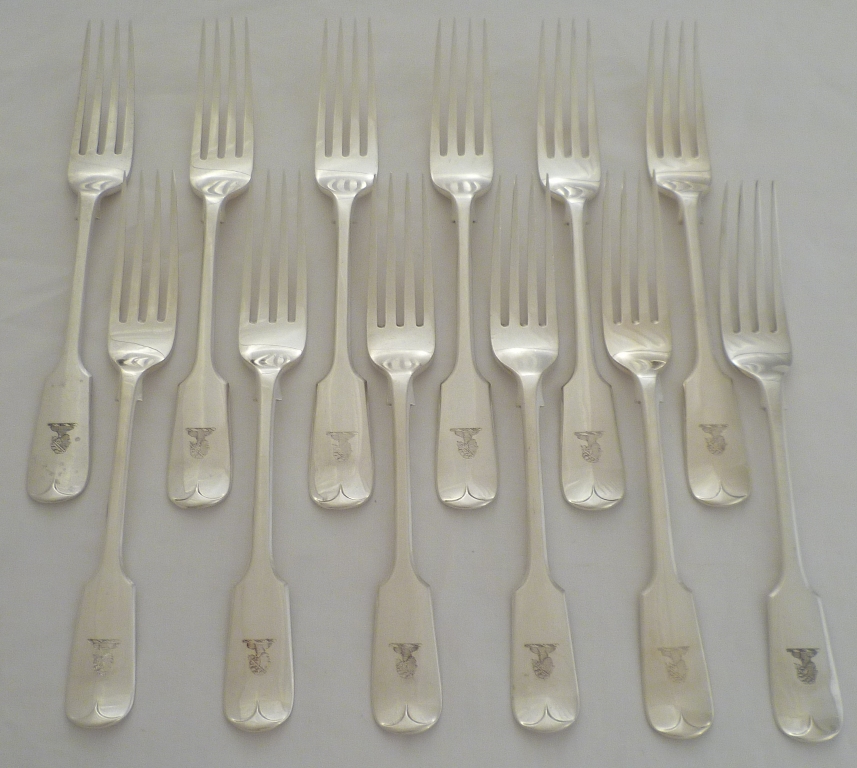 DESCRIPTION | Set of twelve Victorian solid silver Fiddle pattern dessert or salad forks with a frontal Moor's head crest engraving. |