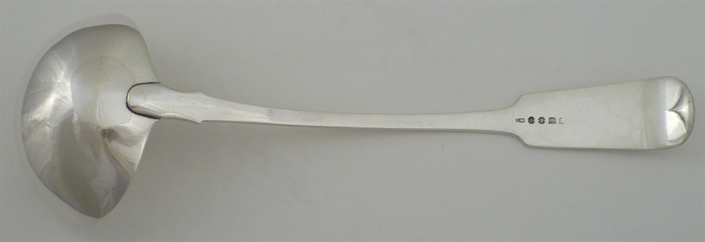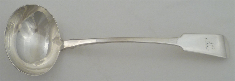 DESCRIPTION | Large William IV Irish silver Fiddle pattern soup ladle with a big, oval bowl and frontal monogram engraving. |