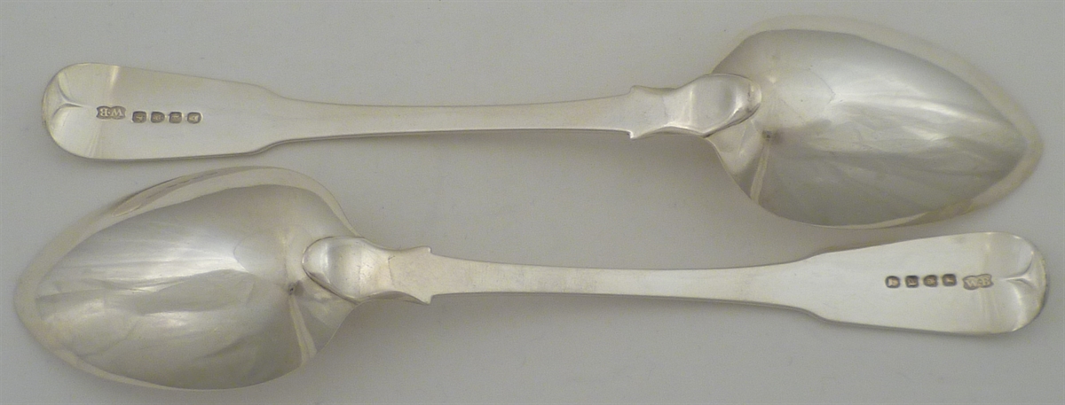 DESCRIPTION | Useful pair of Georgian solid silver Fiddle pattern table or serving spoons with a frontal monogram engraving. |