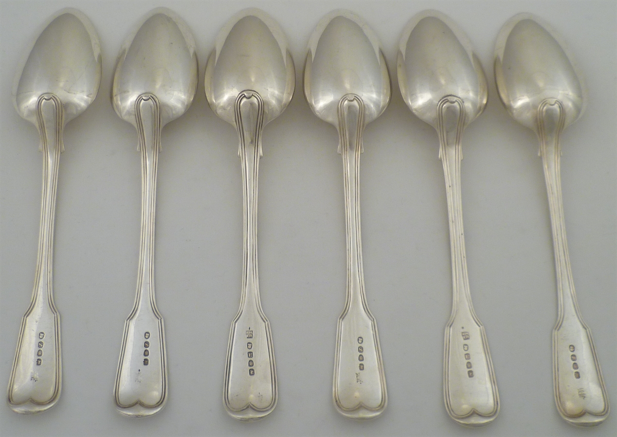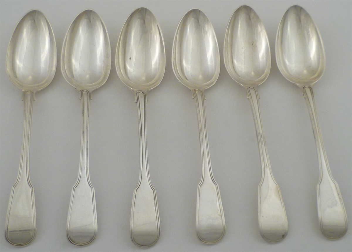 DESCRIPTION | Set of six Georgian solid silver double struck Fiddle & Thread pattern table or serving spoons with no engraving. |