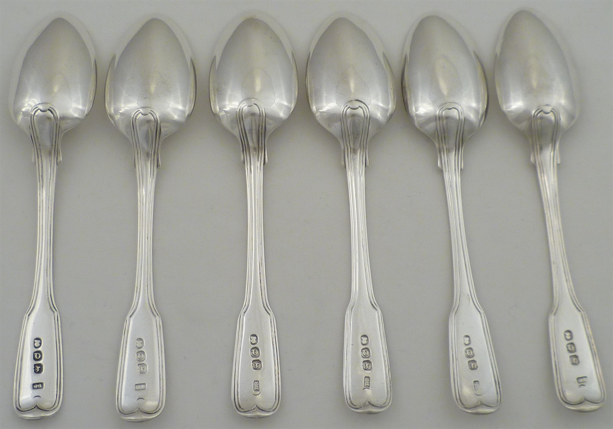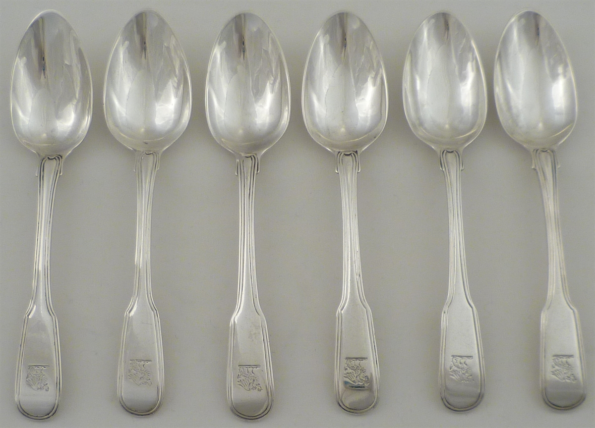 DESCRIPTION | Six Georgian solid silver double struck Fiddle & Thread pattern teaspoons with a frontal crest engraving. |