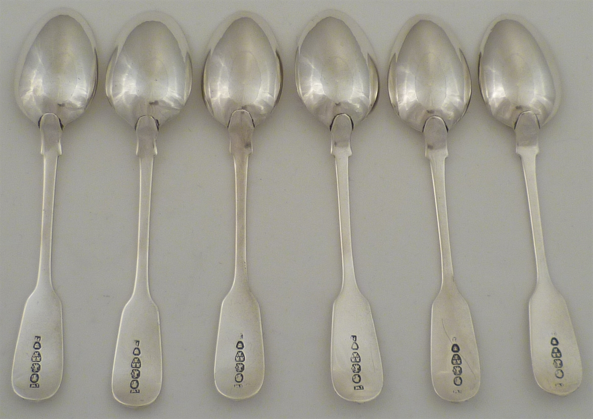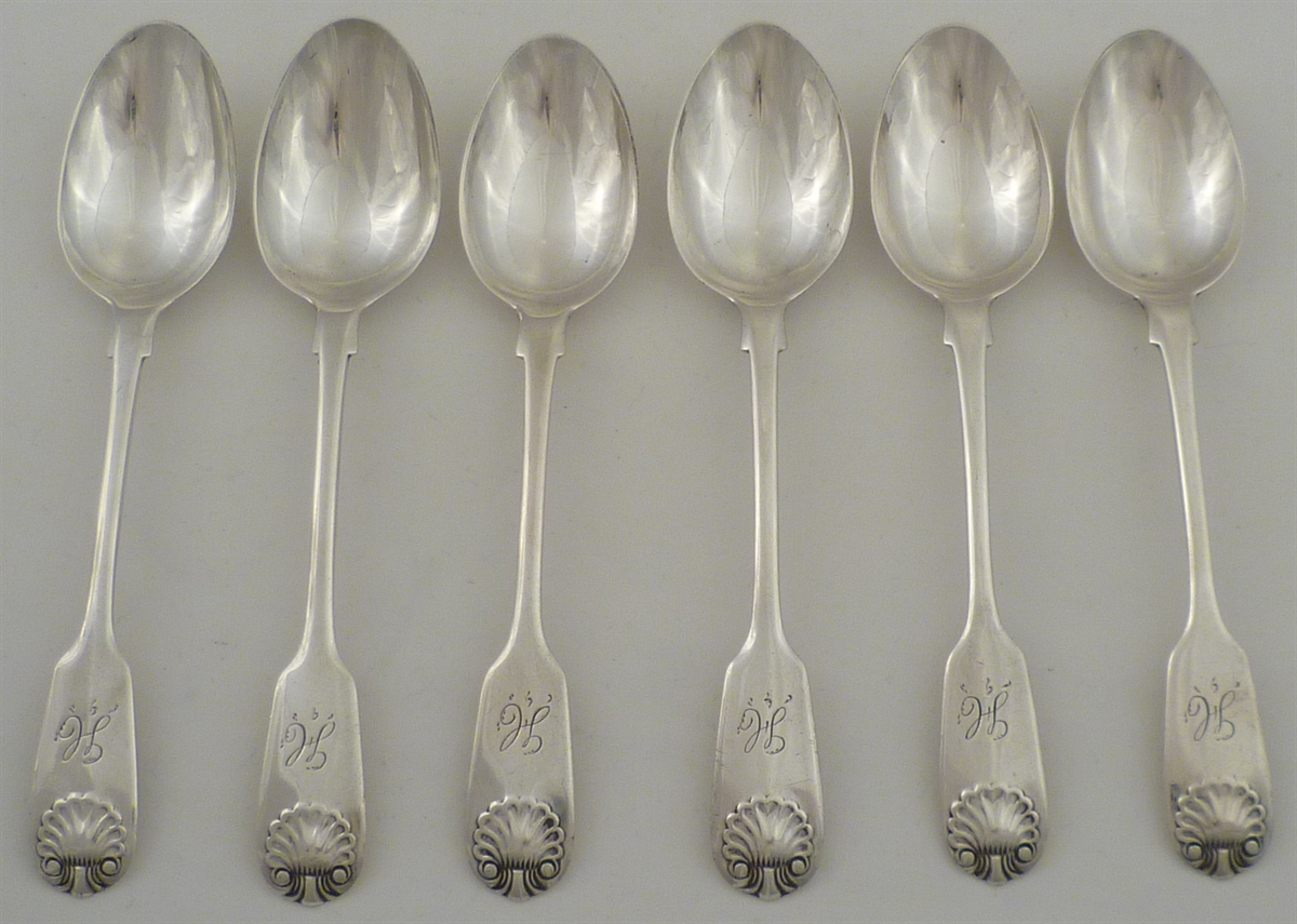 DESCRIPTION | Six Victorian solid silver Fiddle & Shell pattern teaspoons with a frontal engraving. |