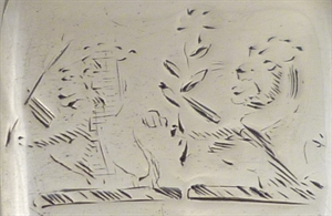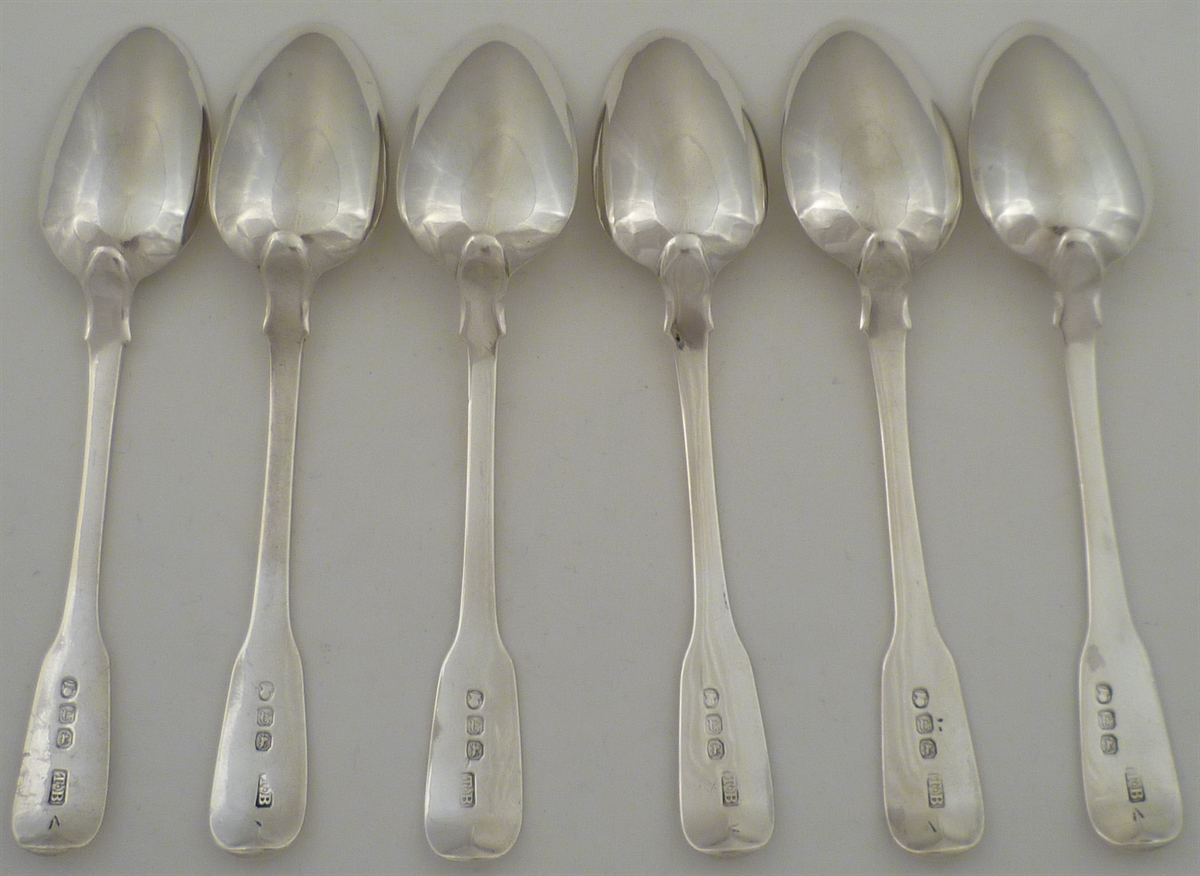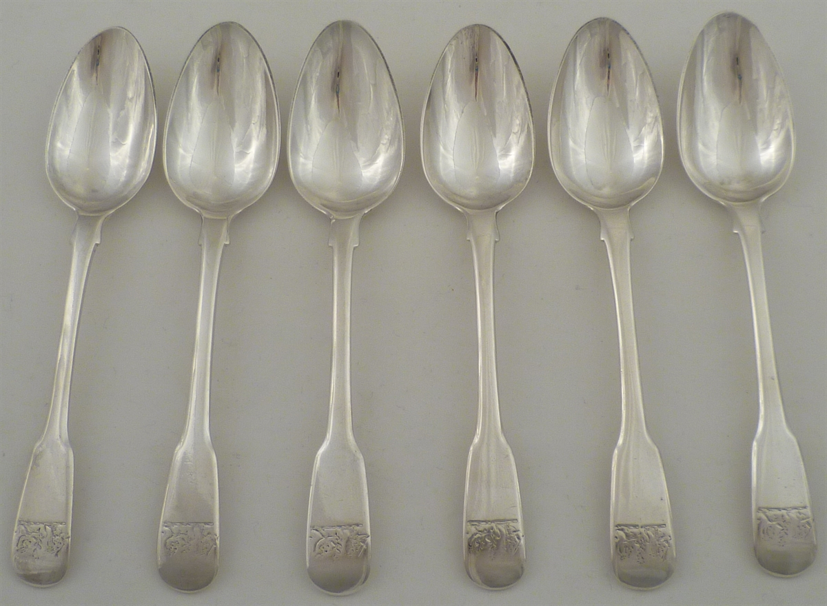DESCRIPTION | Good set of six Georgian solid silver Fiddle pattern teaspoons with an interesting frontal crest engraving. |