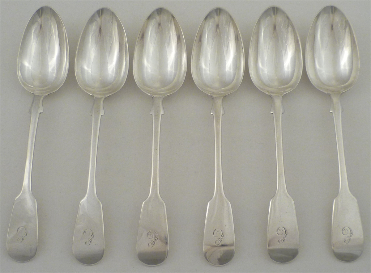 DESCRIPTION | Six large Victorian solid silver Fiddle pattern table or serving spoons with a frontal initial 'E' engraving. |