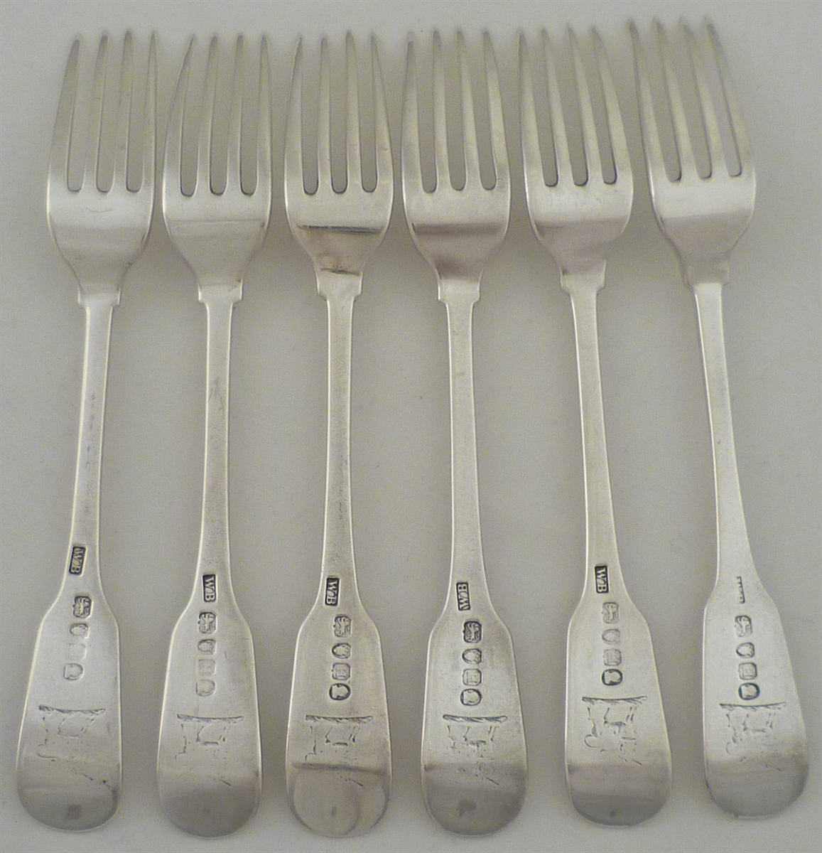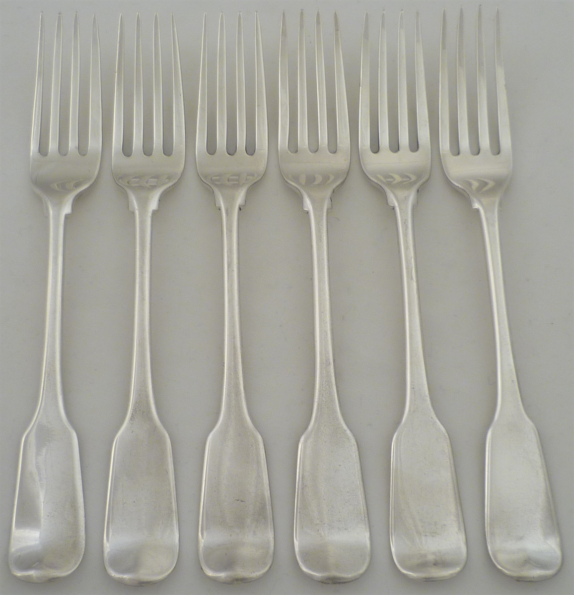 DESCRIPTION | Six Georgian solid silver Fiddle pattern dessert or salad forks with a crest engraving verso. |