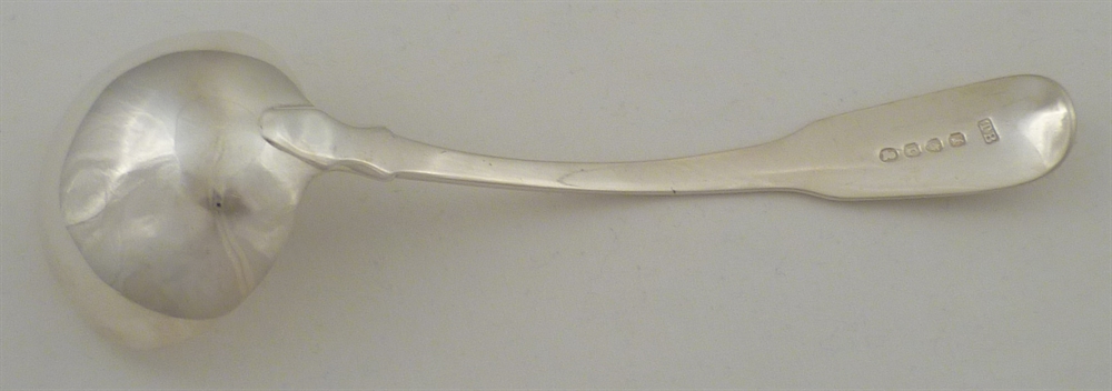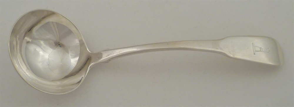 DESCRIPTION | Good Georgian solid silver early Fiddle pattern sauce ladle with a round bowl and frontal crest engraving. |