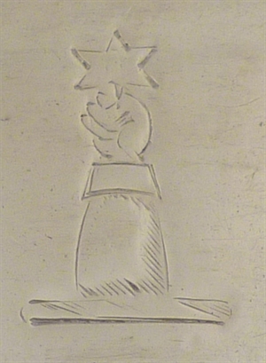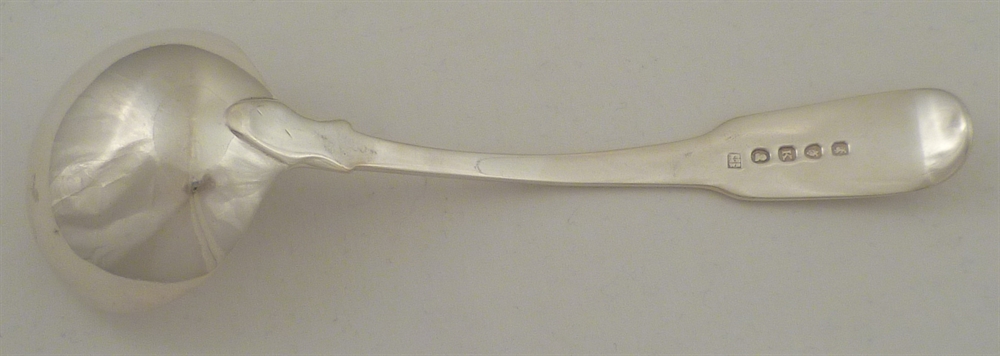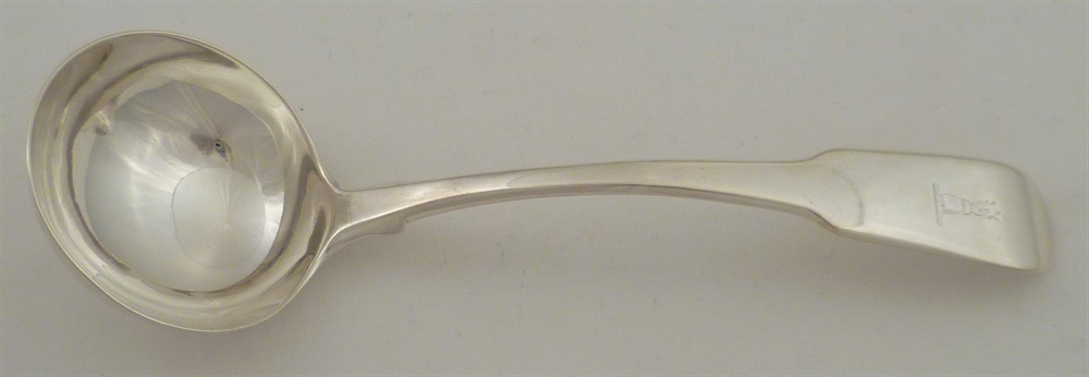 DESCRIPTION | Georgian solid silver early Fiddle pattern sauce ladle with a round bowl and frontal crest engraving. |