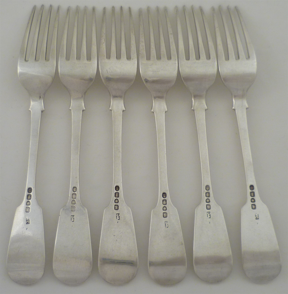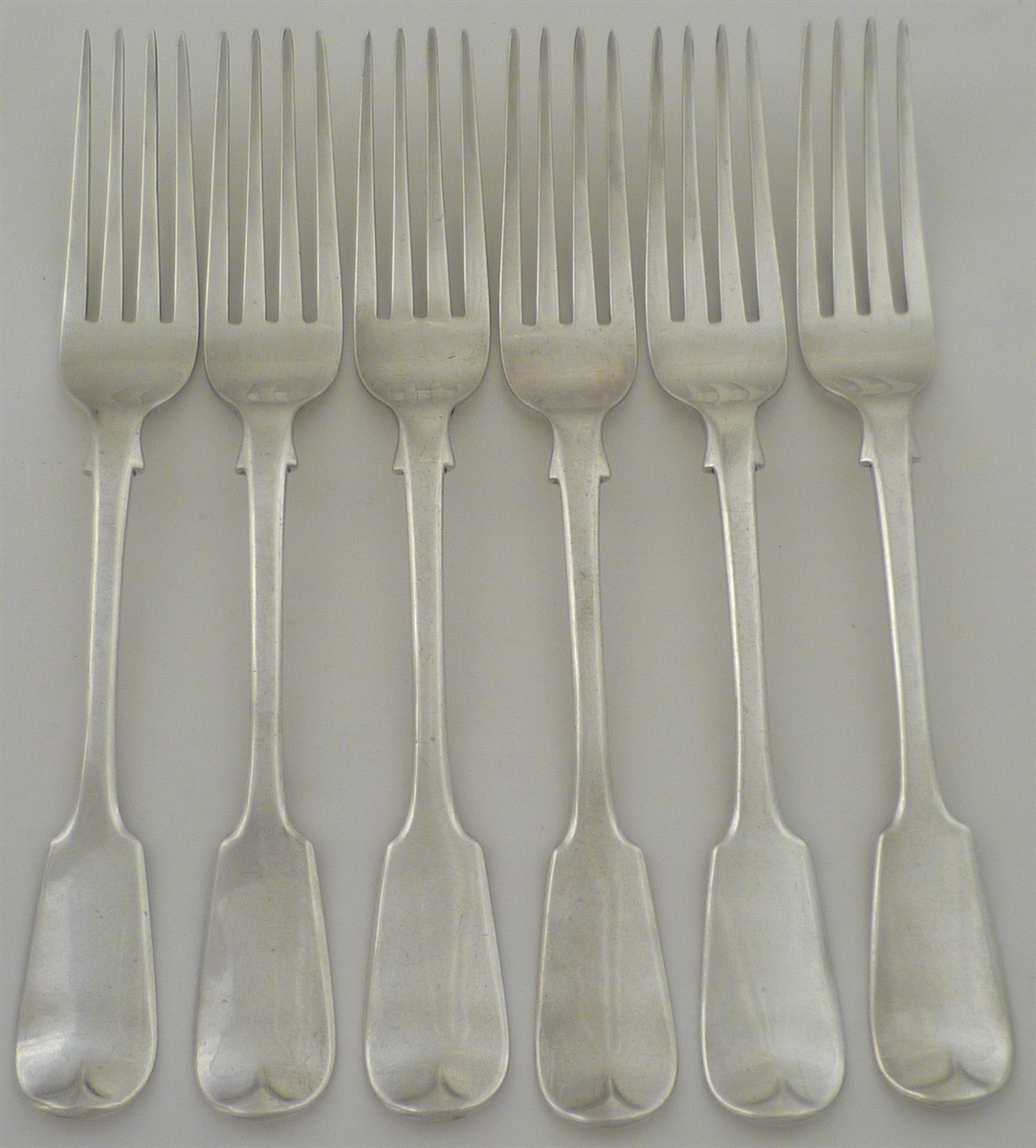 DESCRIPTION | Set of six Georgian solid silver Fiddle pattern table forks with no engraving or erasure. |